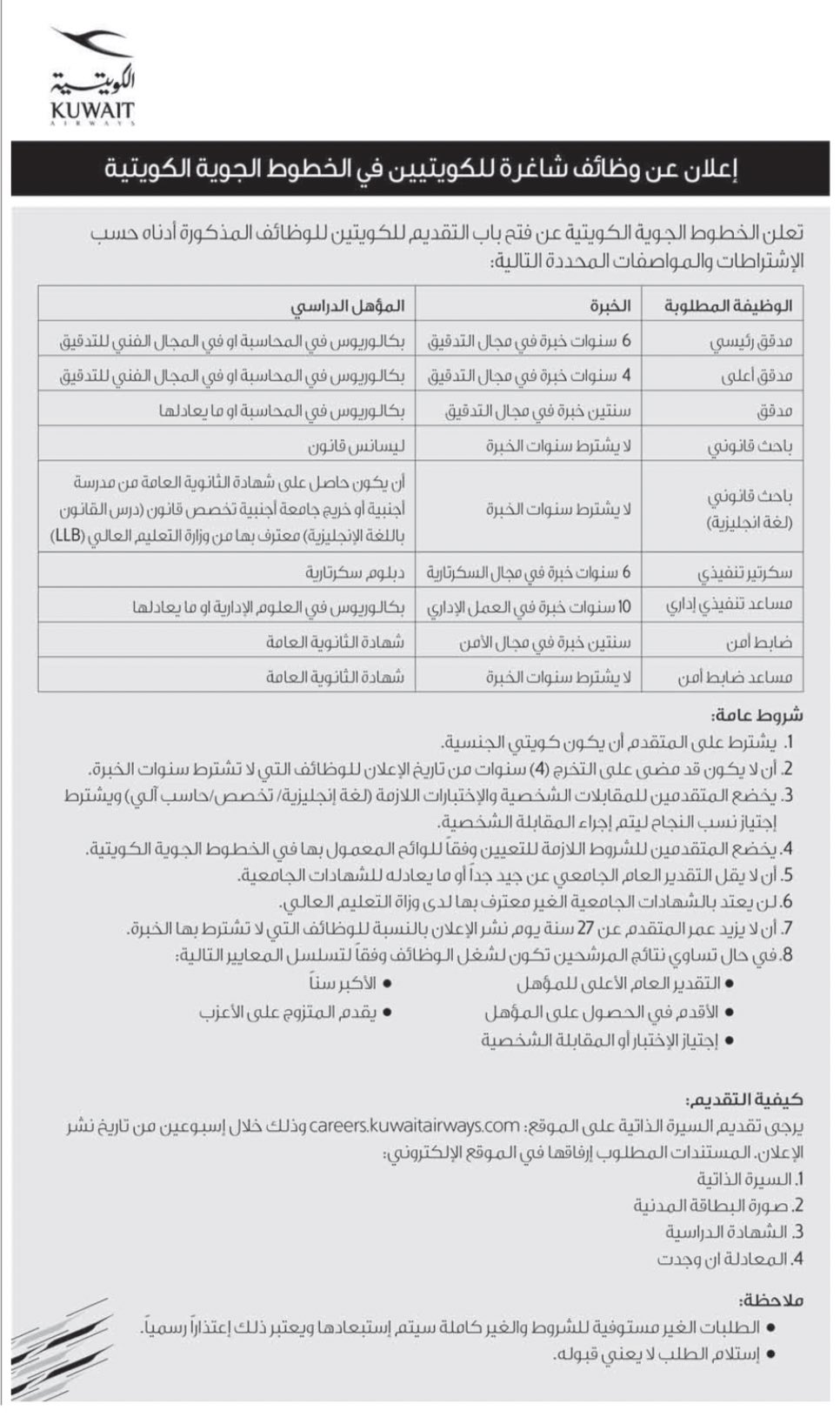 عط الي در توییتر اعلان توظيف في الخطوط الجوية الكويتية لذوي الخبرة و حملة شهادات الثانوية العامة تعلن الخطوط الجوية الكويتية عن فتح باب التقديم للوظائف التالية علما بان فترة التقديم تكون