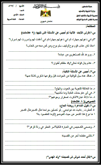 امتحان شهرين في اللغة العربية للصف التاسع الفصل الأول المكتبة الفلسطينية الشاملة