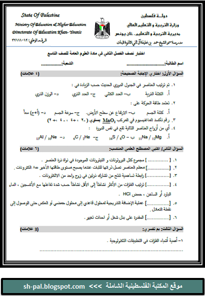 اختبار نصف الفصل الثاني في العلوم للصف التاسع المكتبة الفلسطينية الشاملة