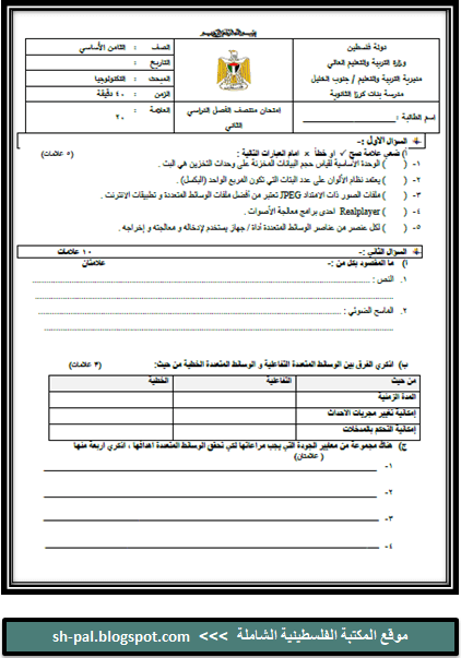 امتحان منتصف الفصل الثاني في التكنولوجيا للصف الثامن المكتبة الفلسطينية الشاملة