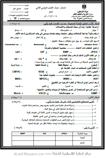 امتحان نصف الفصل الثاني في التكنولوجيا للصف الحادي عشر المكتبة الفلسطينية الشاملة