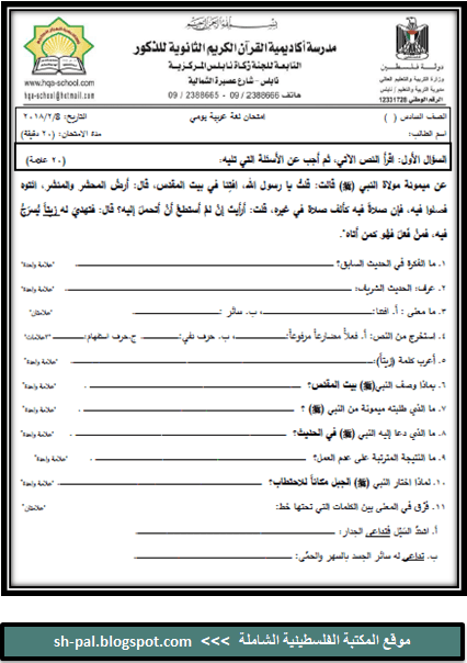 امتحان يومي في اللغة العربية للصف الخامس الفصل الأول المكتبة الفلسطينية الشاملة
