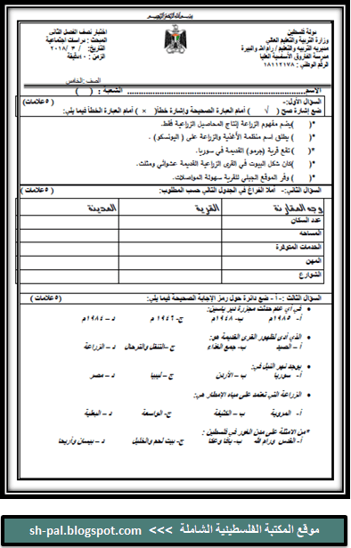 اختبار نصف الفصل الثاني في الدراسات الاجتماعية للصف الخامس المكتبة الفلسطينية الشاملة