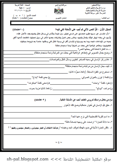 امتحان الشهرين في اللغة العربية للصف التاسع الفصل الأول المكتبة الفلسطينية الشاملة