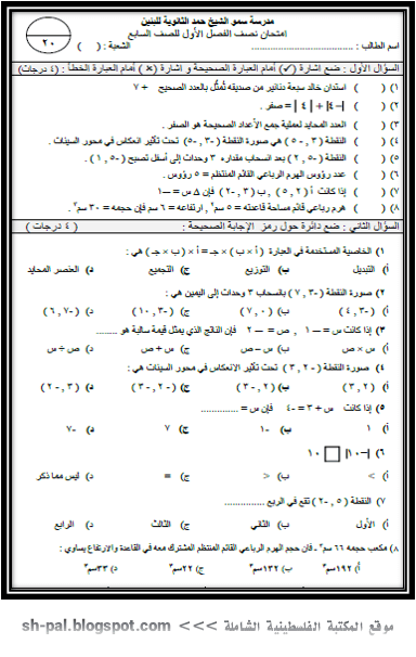 امتحان نصف الفصل الأول في الرياضيات للصف السابع المكتبة الفلسطينية الشاملة