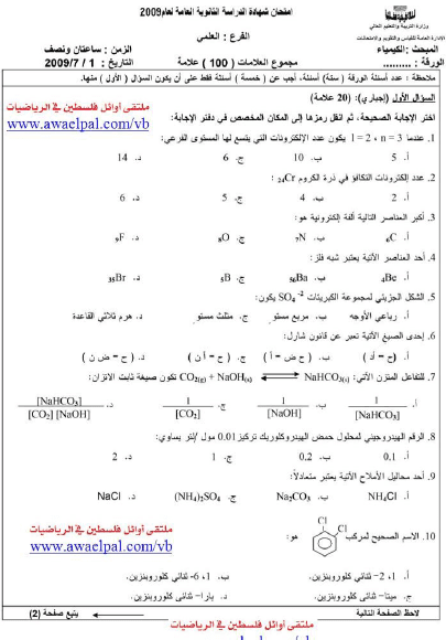 اختبار كيمياء للصف الثاني عشر علمي 2009 الحلول المكتبة الفلسطينية الشاملة