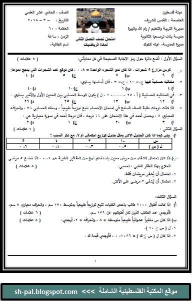 امتحان نصف الفصل الثاني لمادة الرياضيات للصف الحادي عشر علمي المكتبة الفلسطينية الشاملة