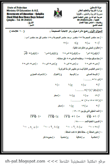 امتحان نهاية الفصل الأول في الرياضيات للصف التاسع المكتبة الفلسطينية الشاملة